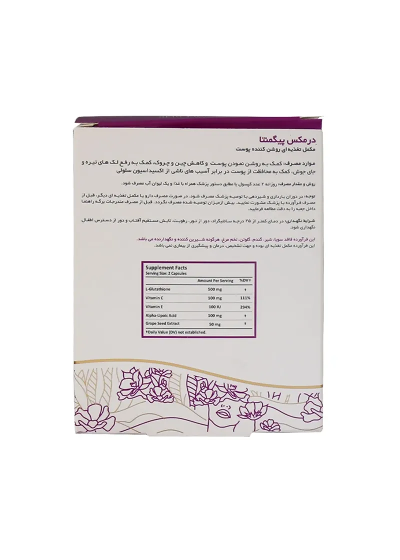 کپسول پیگمنتا (Pigmenta): کپسول پیگمنتا یک مکمل تخصصی روشن کننده و ضد لک است که با داشتن ال-گلوتاتیون، به درمان لک صورت از درون و شفافیت پوست کمک میکند.